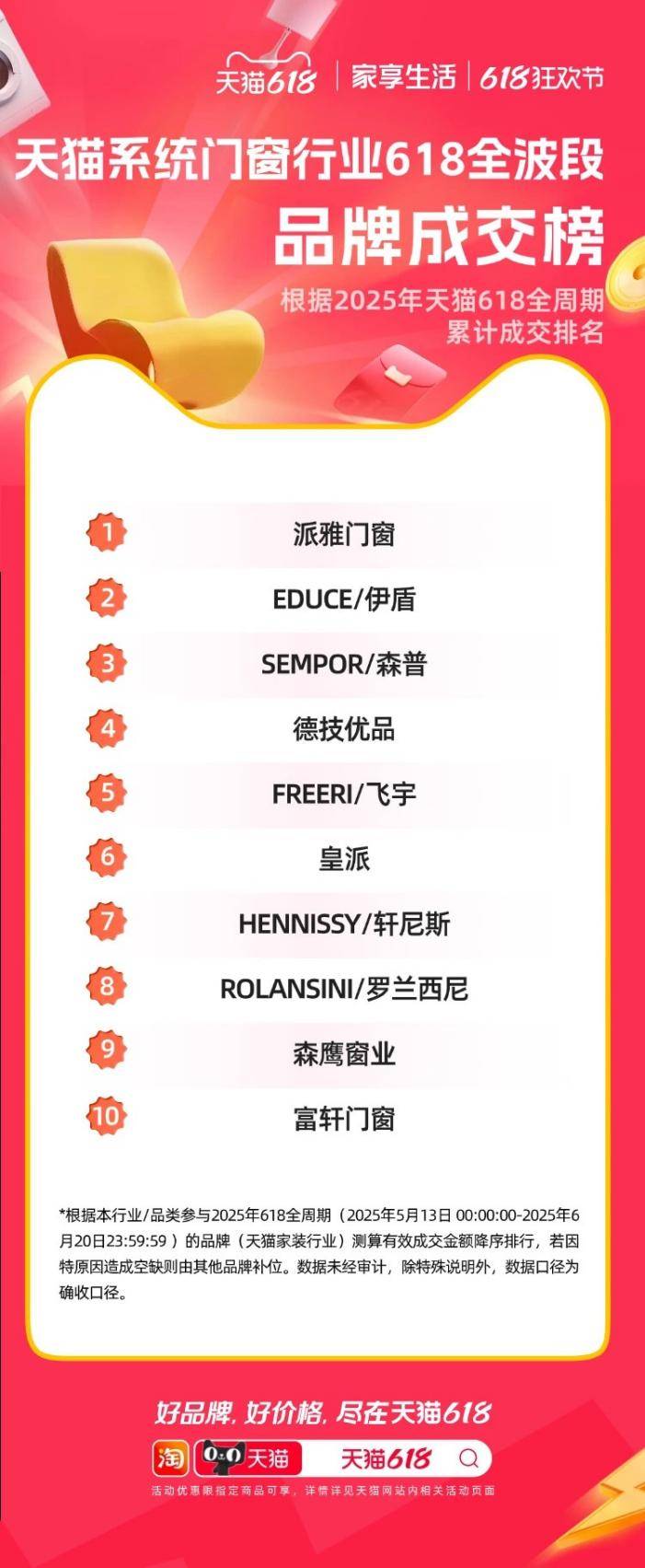2025年天猫618大促落下帷幕,系统门窗行业品牌成交榜TOP10重磅发布,最新权威门窗十大品牌榜单出炉。依据天猫家装行业618 全周期(2025年5月13日- 6月20日)有效成交金额数据,派雅门窗凭借强劲实力斩获榜首,EDUCE / 伊盾、SEMPOR / 森普分列二、三位,德技优品、FREERI / 飞宇、皇派、HENNISSY / 轩尼斯、ROLANSINI / 罗兰西尼、森鹰窗业、富轩门窗也跻身前十,共同勾勒出系统门窗行业的十大品牌全新格局。